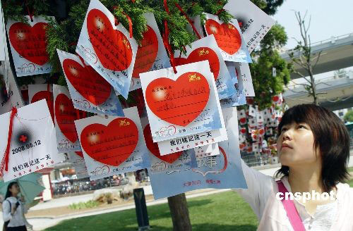五月二十日,郑州女孩在整理翻看松柏树上悬挂的“爱心”牌。五月十九至二十一日是全国哀悼日,郑州社会各界通过不同方式,悼念“五·一二”汶川大地震中失去生命的同胞,为幸存者祈福,街心公园许多树梢挂满“爱心”牌。