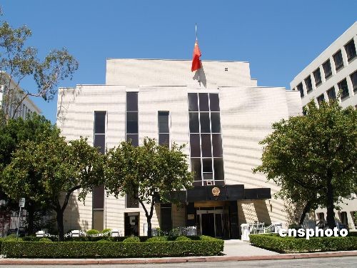图:洛杉矶中领馆降半旗向汶川地震遇难同胞致哀