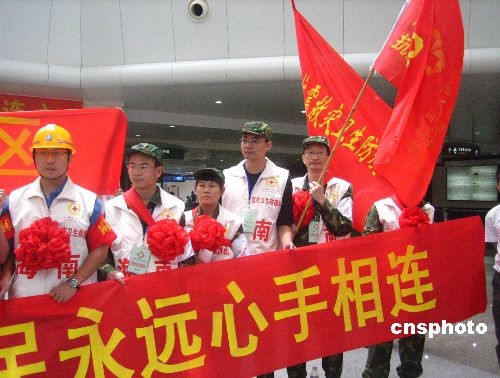 五月二十日,首批海南青年医疗卫生抗震救灾志愿者服务队共二十五人,从海口美兰机场出发,前往四川绵阳平武县抗震救灾。该批具有专业医疗技能及抗震经验的志愿者,来自海南省人民医院、海南省及各市县疾控中心,由海南省卫生厅及共青团海南省委共同招募。