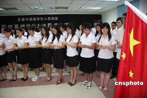 五月二十一日上午,中国驻泰大使馆教育组吊唁堂烛光点点,哀思眷眷。来自泰国易三仓大学、亚洲理工学院、泰国商会大学、曼颂德皇家大学、农业大学、兰实大学、拉查蒙坤大学、东亚大学等曼谷及周边地区近十所大学的六十多名中国留学生代表,手持点燃的蜡烛,默默地向汶川地震遇难同胞表达哀悼之情。