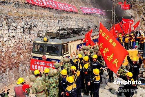 5月24日上午,首列满载运往四川灾区救灾物资的抢977次列车,从宝成线徽县至虞关站间109号隧道安全通过,这标志着因地震塌方在隧道内脱线起火、中断行车283小时的宝成铁路全线,比预计时间提前7天恢复通车。 宝成铁路是通往西南的铁路大动脉,是四川抗震救灾的生命线。5月12日14时28分,因四川汶川发生8级强烈地震引发山体崩塌,致使运行中的一列货物列车在西安铁路局管内宝成线徽县至虞关站间撞巨石脱线,12节装有汽油的罐车被埋在109号隧道中起火燃烧,造成通往四川地震灾区的大动脉宝成铁路中断行车。险情发生后,经过铁路职工、解放军指战员、武警官兵等2200多名抢险人员连续12个昼夜奋力抢修,终于将宝成铁路109号隧道顺利抢通。