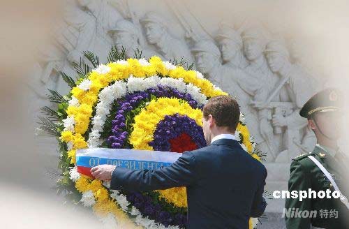 5月24日,俄罗斯总统梅德韦杰夫在北京天安门广场向人民英雄纪念碑敬献花圈。中新社发 廖文静 摄