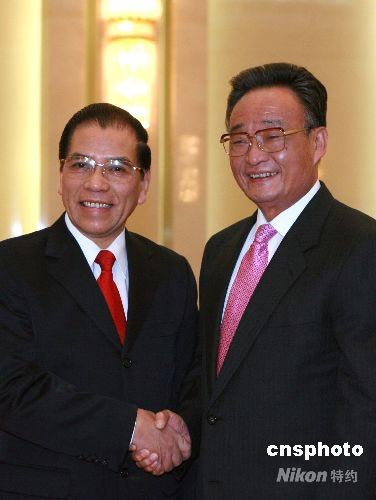 5月30日,中共中央政治局常委、全国人大常委会委员长吴邦国在北京人民大会堂会见越南共产党中央委员会总书记农德孟。中新社发 廖文静 摄