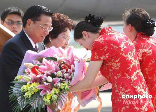 图:江丙坤抵达北京首都机场接受鲜花