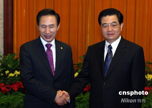 8月9日,中国国家主席胡锦涛在北京人民大会堂会见韩国总统李明博。中新社发 廖文静 摄