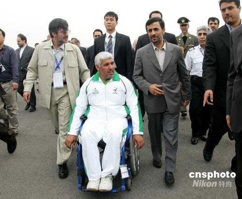图为伊朗将参加北京残奥会的运动员Mirzaei Jaberi(左二)到机场迎接内贾德总统。