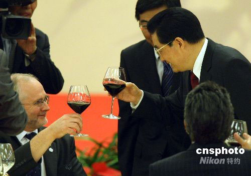 图为胡锦涛在欢迎宴会上向国际残奥委会主席克雷文祝酒致意。