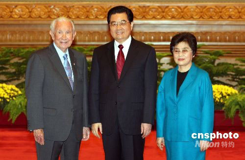 九月六日,中国国家主席胡锦涛和夫人刘永清在北京人民大会堂欢迎出席2008年残奥会的各国贵宾。图为胡锦涛夫妇与国际奥委会名誉主席萨马兰奇先生合影。中新社发 任海霞 摄