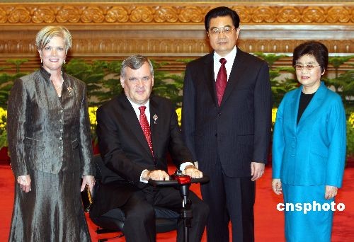 图:胡锦涛夫妇欢迎出席北京残奥会的加拿大安大略省省督