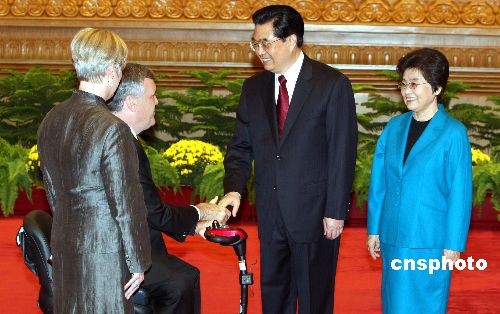 图:胡锦涛夫妇欢迎出席北京残奥会的维尔布鲁根