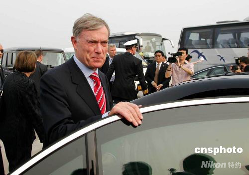 9月6日下午,德国总统克勒偕夫人乘专机抵达北京首都国际机场,前来出席北京残奥会开幕式及相关活动。中国政府代表、外交部部长助理吴红波到机场迎候。中新社发 富田 摄