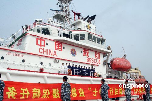 9月21日下午,中国装备最先进、救助功能最全的大马力远洋专用救助船“南海救一一二”轮一切准备就绪,从上海外高桥码头出征西太平洋海域,待命深海执行神舟七号载人航天飞行任务海上应急救援任务。中新社发 陆从兵 摄