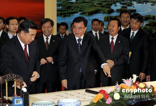 9月22日,中共中央政治局常委、中央纪委书记贺国强,在卷头为“宁夏回族自治区成立50周年成就展”签名后,提议中央代表团其他成员也为该展签名。当日下午,以贺国强为团长的中央代表团在银川参观“宁夏回族自治区成立50周年成就展”。中新社发 廖攀 摄