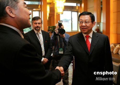图为中国商务部部长陈德铭(右)与来宾握手致意。