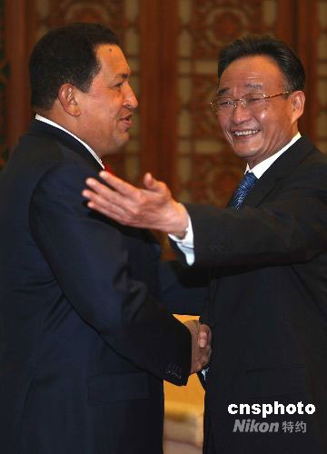 9月24日下午,中国全国人大常委会委员长吴邦国在北京人民大会堂会见来访的委内瑞拉总统查韦斯。中新社发 任晨鸣 摄