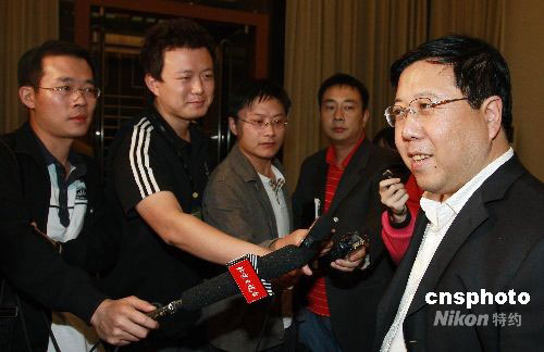 “长征二号F”运载火箭总设计师荆木春在机场接待厅被记者追踪采访。