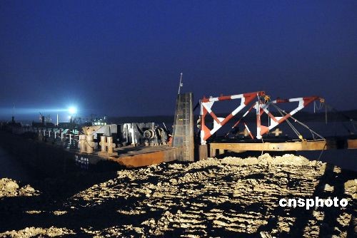 黑龙江省抚远县七号界碑处,中方在铺设通往黑瞎子岛的浮桥。