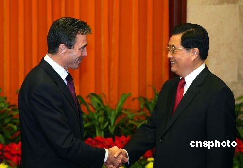 10月22日,中国国家主席胡锦涛在北京人民大会堂会见前来出席第七届亚欧首脑会议的丹麦首相拉斯穆森。中新社发 廖文静 摄
