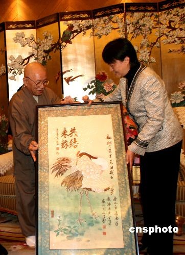 扬州女市长王燕文和松浦俊海长老互赠礼品“共结来缘”。