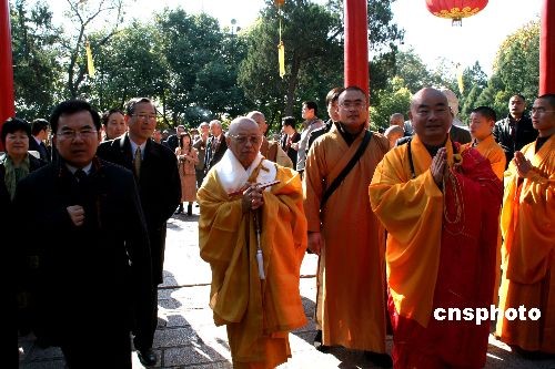 11月11日,日本奈良市长藤原昭、唐招提寺长老松浦俊海率友好代表团一行,在扬州市领导陪同下拜访扬州大明寺并举行鉴真大和尚追思会。大明寺能修大师率两序大众在山门亲自迎接,并举行了隆重的欢迎仪式。中新社发 崔佳明 摄