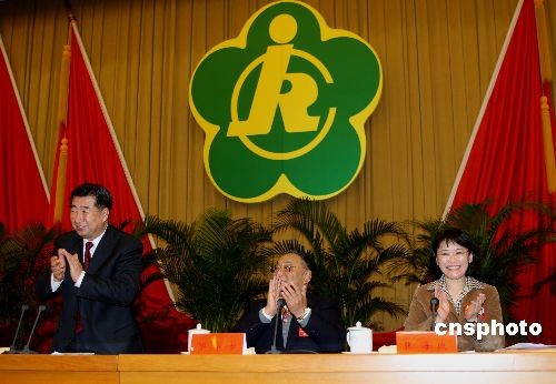 国务院副总理回良玉祝贺邓朴方(中)当选为中国残联名誉主席,张海迪(右)当选为中国残联主席。