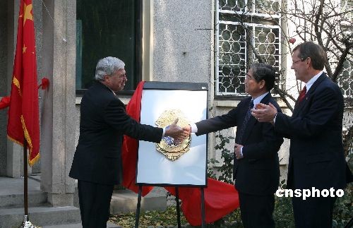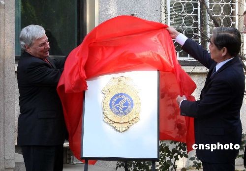 11月19日,美国食品药品监督管理局(FDA)在中国的首个办事处在北京成立,美国食品药品管理局局长埃森巴赫及中国卫生部副部长、国家食品药品监督管理局局长邵明立为该机构揭牌。(FDA)中国办事处主要工作包括:帮助中国建设并完善食品安全监管能力,同时将美方人员派驻中国检查出口至美国的食品安全。 中国也正在筹划在美国设立对等的食品药品安全管理机构。中新社发 张宇 摄