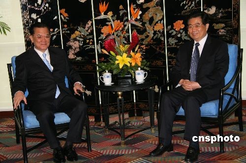 胡锦涛与夫人刘永清,当地时间二十一日上午在秘鲁首都利马同连战和夫人连方瑀会面,这是胡锦涛与连战的第六次会面,也是今年以来两人第三次会面。中新社发 齐彬 摄