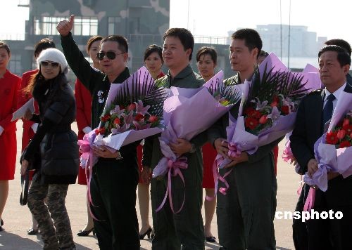 11月28日,中国首架自主研制、拥有完全自主知识产权的新型涡扇支线客机ARJ21-700飞机在上海成功首飞,三名试飞员凯旋归来受到热烈欢迎。图为驾驶飞机的试飞员赵鹏竖起大拇指赞叹ARJ21-700飞机此次完美的首飞蓝天之旅。中新社发 孙自法 摄