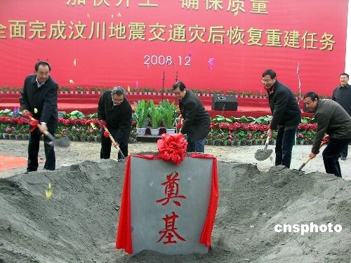 12月3日上午,在四川汶川大地震造成的滑坡山体边,国道213线汶川至映秀公路的映秀施工现场,汶川地震交通灾后恢复重建项目集中开工仪式举行。交通运输部部长李盛霖,四川省省长蒋巨峰、副省长王宁,四川省交通厅厅长高烽等,挥锨为国道213线汶川至映秀段、省道303线卧龙至日隆段灾后重建项目奠基。中新社发 杨杰 摄