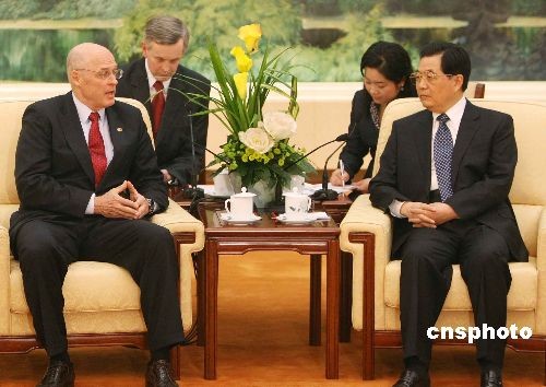 12月5日下午,中国国家主席胡锦涛在北京人民大会堂会见出席第五次中美战略经济对话的美国代表团时,与美国财政部长保尔森交谈。中新社发 任晨鸣 摄