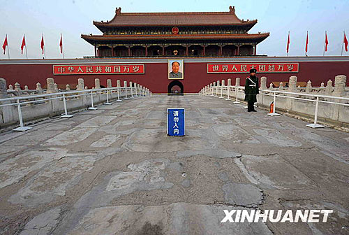 据北京市文物局9日透露,为迎接2009年国庆60周年,确保游客和文物安全,北京市文物局已于近日启动了天安门金水桥加固修缮工程,整个工程预计将于2009年5月完工。天安门金水桥是整个天安门景观的重要组成部分,因游客众多以及风化等自然因素,天安门金水桥桥面此前多处出现破损,栏杆部分也出现裂缝,存在一定的安全隐患。新华社记者罗晓光摄