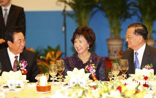 海协会会长陈云林与中国国民党荣誉主席连战夫妇交谈。