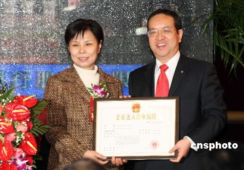 国家工商行政管理总局企业注册局局长郭志斌(左)向国家开发银行行长蒋超良颁发《营业执照》。