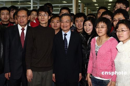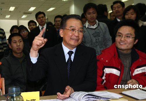 12月20日,中国国务院总理温家宝在北京航空航天大学参加“中日青少年友好交流年”闭幕式活动后,特地前往该校图书馆看望大学生,并与学生们一起就中国的飞机制造、金融危机、就业形势等话题进行了长时间的交谈。中新社发 杜洋 摄