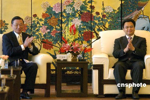 一月九日中午,广州花园酒店,广东省副省长万庆良会见台湾海基会董事长江丙坤及海协会与海基会联合参访团一行。中新社发 柯小军 摄