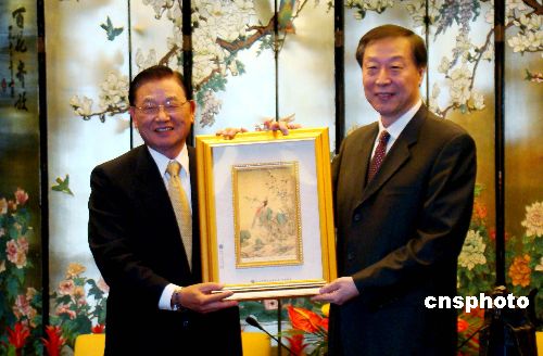 一月十日午间,江苏省长罗志军在南京会见台湾海基会董事长江丙坤,以及海协会与海基会联合参访团一行。会见中,罗志军希望台商坚定在江苏投资创业的信心。中新社发 丁梅 摄