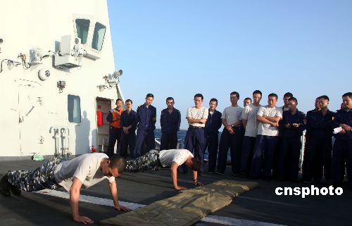 当地时间1月11日下午,正在亚丁湾海域执行护航任务的“海口”号导弹驱逐舰举行甲板运动会最后两个项目赛事,图为参赛官兵参加俯卧撑项目比赛。中新社发 孙自法 摄