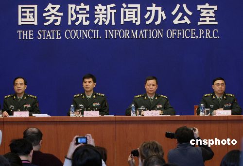 1月20日上午,国务院新闻办公室在北京举行发表《2008年中国的国防》白皮书新闻发布会,国防部新闻事务局局长、国防部新闻发言人胡昌明大校做主题发言,解放军总参、总政、总后、总装各部相关人士到会回答记者提问。中新社发 宋吉河 摄