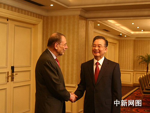 正在这里对欧盟总部进行正式访问的中国总理温家宝,当地时间一月三十日上午在下榻饭店会见了欧盟理事会秘书长兼共同外交与安全政策高级代表索拉纳(左)。双方对中欧关系重要性均给予高度肯定。