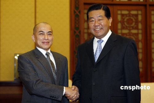 2月20日,全国政协主席贾庆林在北京人民大会堂会见了柬埔寨国王西哈莫尼。中新社发 盛佳鹏 摄