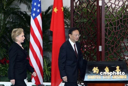 2月21日中午,中国外交部部长杨洁篪与美国新任国务卿希拉里·克林顿在北京钓鱼台国宾馆举行会谈后共同会见记者,介绍中美双方会谈情况并回答媒体提问。中新社发 任晨鸣 摄