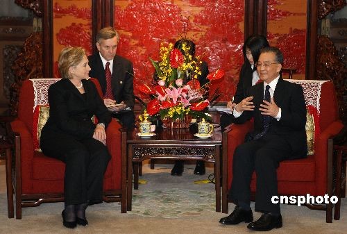 2月21日下午,中国国务院总理温家宝在北京中南海紫光阁会见美国新任国务卿希拉里·克林顿。温家宝在会见中引用《孙子兵法》中“同舟共济”的成语,比喻中美两国关系。中新社发 任晨鸣 摄
