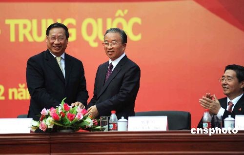 二月二十三日下午,中国和越南在广西凭祥友谊关口岸举行仪式,隆重庆祝陆地边界勘界立碑圆满结束。中国国务委员戴秉国(中)和越南副总理兼外长范家谦(左)分别代表两国政府出席仪式并致辞。图为两国领导人在台上亲切握手。中新社发 蒋雪林 摄