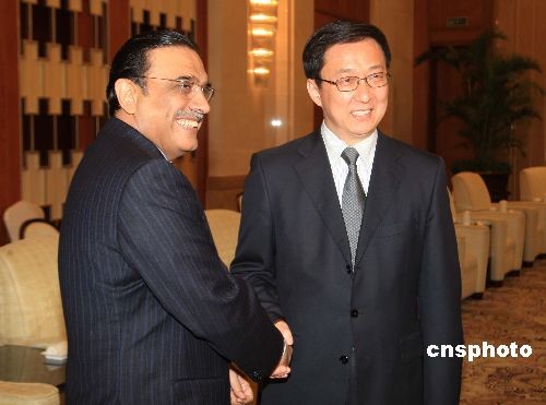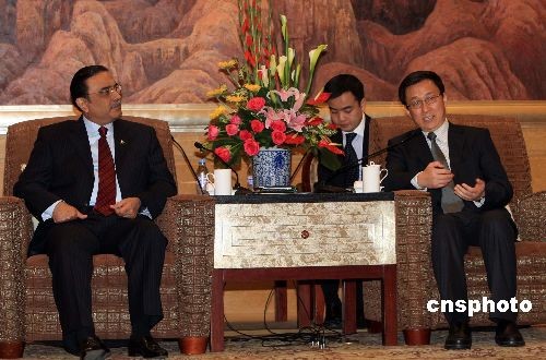 2月23日晚,上海市市长韩正在上海虹桥迎宾馆会见巴基斯坦总统扎尔达里,韩正热情邀请巴基斯坦总统参观2010年上海世博会。中新社发 潘索菲 摄