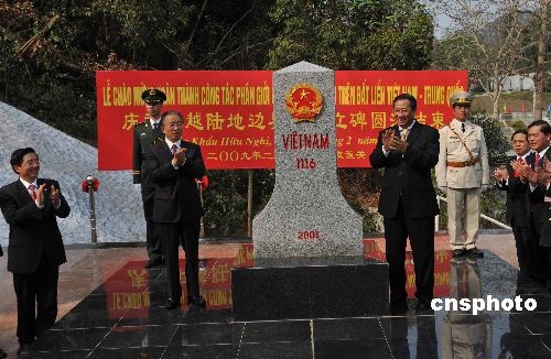 二月二十三日,中国和越南共四百多人相聚在友谊关口岸,举行仪式隆重庆祝中越陆地边界勘界立碑工作圆满结束。仪式结束后,中国国务委员戴秉国(左)和越南副总理兼外长范家谦(右)共同为中越两国边境的第一一一六号界碑揭幕。中新社发 蒋雪林 摄