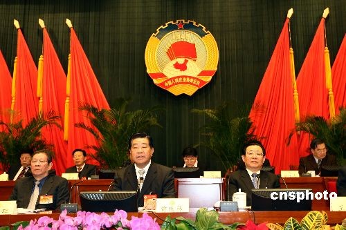 2月27日,政协第十一届全国委员会常务委员会第四次会议在北京闭幕。中共中央政治局常委、全国政协主席贾庆林(中)出席会议并作讲话。中新社发 杜洋 摄