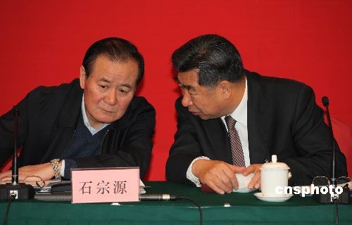 图为回良玉(右)与贵州省委书记石宗源交谈。