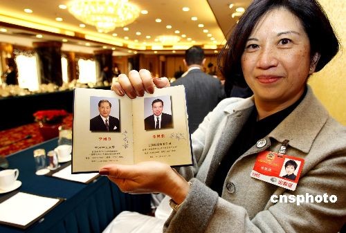 3月6日,香港溢达集团董事会副主席杨敏德在香港界分组讨论会上,拿着大会特制的香港特别行政区政协委员通讯录让委员们签名。中新社发 傅丹丹 摄