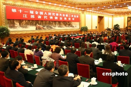 3月7日,全国人大江苏代表团在人民大会堂举行全体会议。中新社发 杜洋 摄
