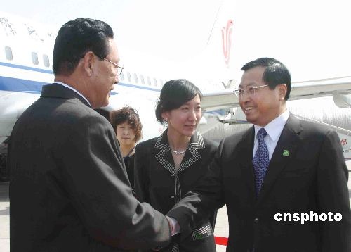 应国务院总理温家宝的邀请对中国进行正式友好访问的朝鲜内阁总理金英日,三月十七日中午由北京乘机抵达济南。图为山东省副省长才利民(右)在济南国际机场迎接金英日总理。中新社发 张璐 摄